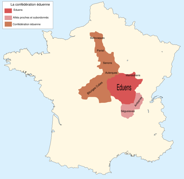 Les Romains firent alliance avec eux, et le sénat les proclama frères de la république. Rome profita de la rivalité qui divisait les Éduens et les Arvernes pour intervenir dans les affaires de la Gaule et l'asservir plus facilement en 57 ans av. J.-C.