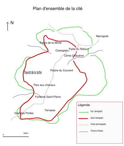 S'étalant sur une surface de 200 hectares, l'oppidum était protégé par un rempart extérieur. Un second rempart intérieur fut construit par la suite pour des raisons encore assez peu connues. Le terme oppidum, utilisé par Jules César dans ses commentaires, désigne une ville abritant une population fixe, qui pouvait en cas de danger recevoir les populations environnantes.