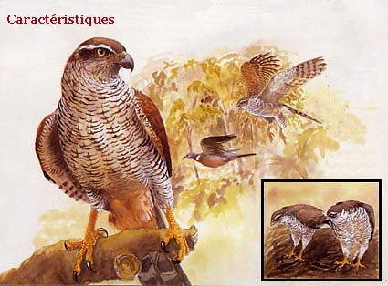 L'adulte a un sourcil blanc, il est gris brun foncé dessus, plus pâle dessous et finement barré. Sa queue est brune barrée. La femelle est plus grosse que le mâle qui peut être confondu avec la femelle de l'épervier.