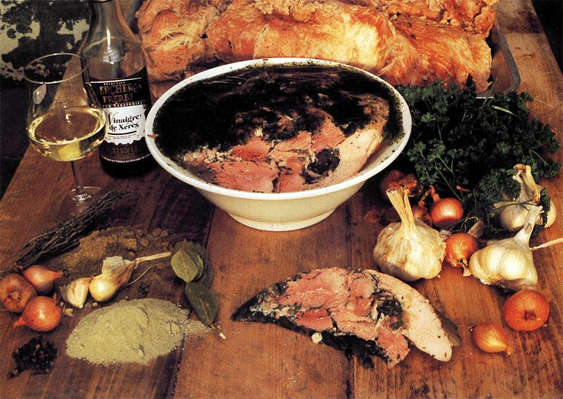 Couper le jambon et les pieds de veau, de porc, et salé en morceaux ; les mettre dans un plat creux, mélanger avec les oeufs durs entiers. Verser dessus le bouillon bien reposé et bien dégraissé.